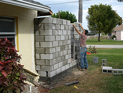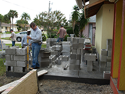 The two masons starts at the front corners, the next steps are the connecting walls to the house, ...