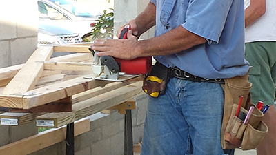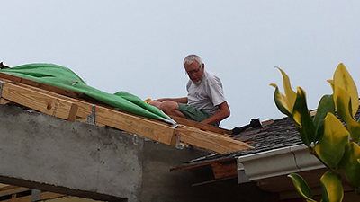 And now Juergen and Patrick start with the valley trusses which need to be connected to the existing roof. The target is to be ready with the trusses till the evening. Tomorrow stay plan to begin with nailing the plywood down.