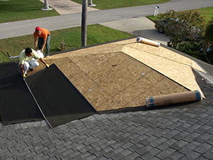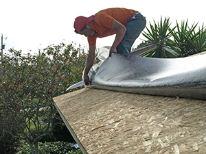 Unfortunately he will only be able to put the self-adhesive tar paper on the plywood and nothing else as his crew forgot their complete set of tool at another building site in Port Charlotte. Even a ladder and a hammer has to be supplied by us.