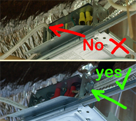 As the distance between the lamps and the first nail clamp on the wood is bigger than 6" it is necessary to stabilize the cable from the lamps separately by cable clamps (grombits) though the lamps have their own locking mechanism which is very strong!