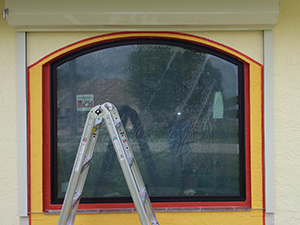 Maria paints the small stripe around one of the archtop windows. The second one will be done tomorrow! |