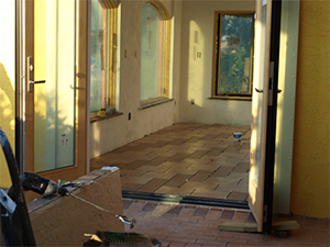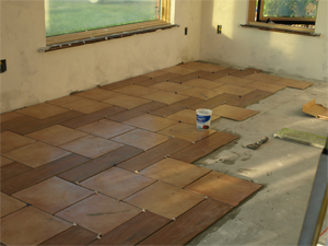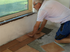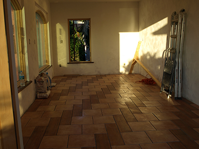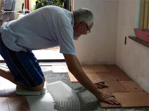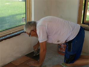 After Juergen has painted the ceiling he will start with the floor today. As we expect paint drops or similar on the floor of Maria's Art Studio we decided to lay down porcellain tiles.